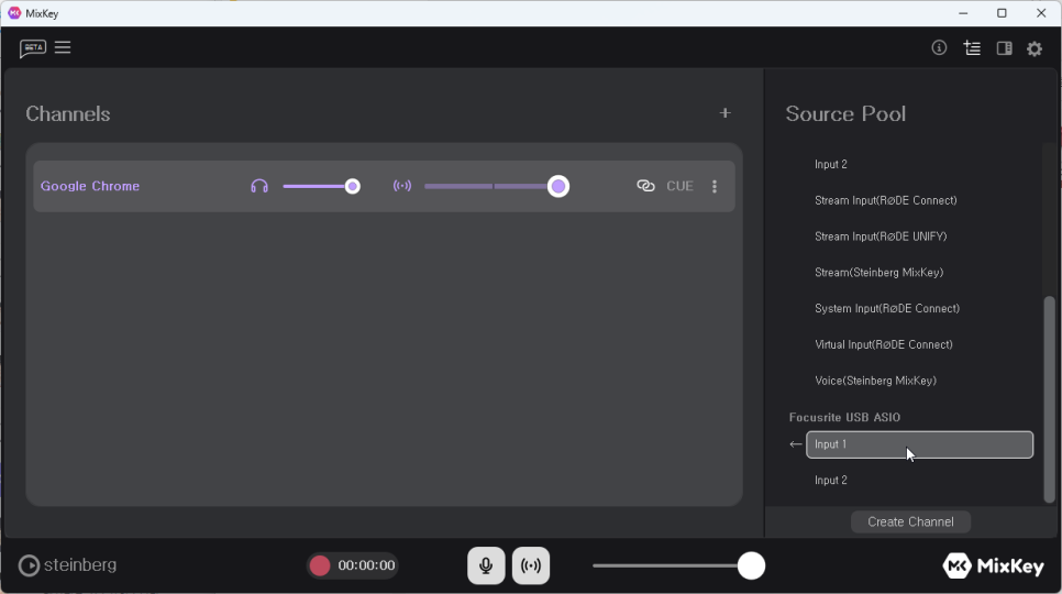 Chrome을 믹스 패널에 올려놓았으면 이번에는 마이크 입력을 선택해 줍니다. 믹스키에서는 WDM 채널뿐만 아니라 그보다 레이턴시가 적은 ASIO 채널을 사용할 수도 있습니다. 조금이라도 레이턴시를 줄이기 위해 WDM 채널 대신 Focusrite USB ASIO 카테고리에서 마이크 채널을 선택해 줍니다. Solo의 XLR 채널은 1번이므로 1번 채널을 믹스패널에 올려 줍니다.