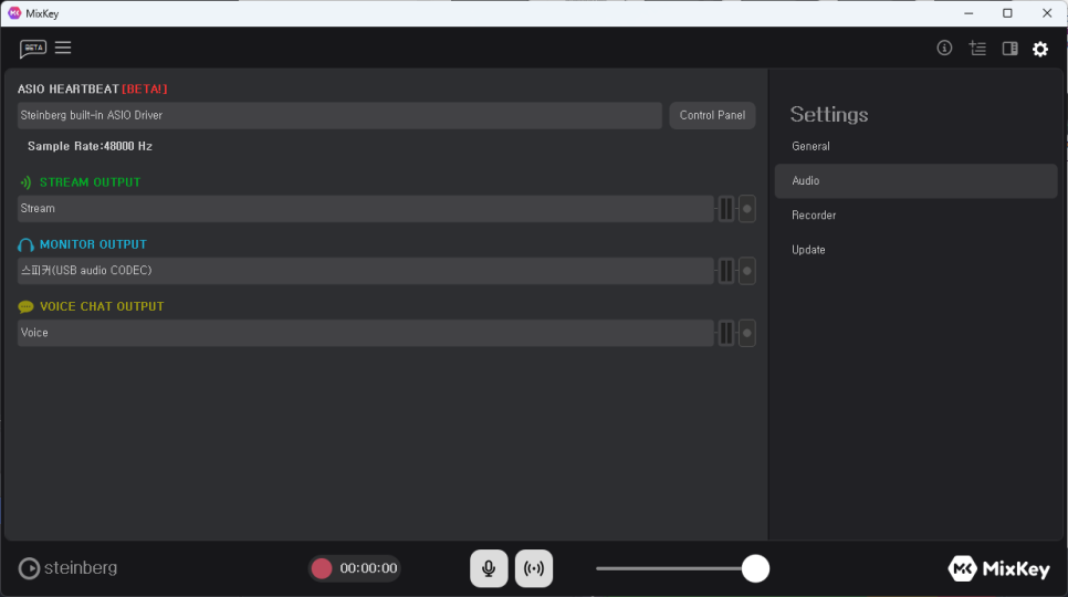 스칼렛 솔로와 설정법은 거의 비슷합니다. MXL Tempo는 ASIO를 지원하지 않으니 ASIO HEARTBEAT는 기본값인 Steinberg built-in ASIO Driver로 그대로 둡니다. Stream, Voice 아웃풋도 동일하게 설정하시고 모니터 출력만 Tempo로 설정해 줍니다. 제 컴퓨터에 Tempo를 연결했을 때 출력 채널은 스피커(USB Audio CODEC)으로 나타났습니다.